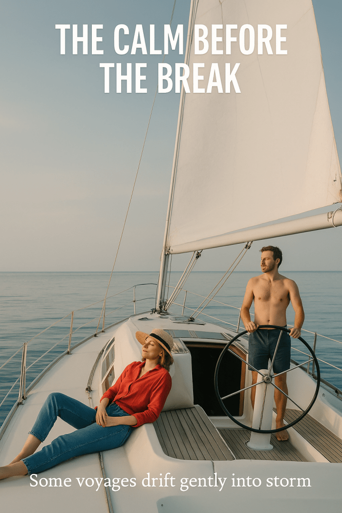 He sets sail with Natasha, who sunbathes nude on the deck of Surly Mermaid. They banter about stingrays, sharks, and figurehead superstitions. Natasha beams, thinking their future is bright. She hints at her pregnancy, full of trust and affection.
